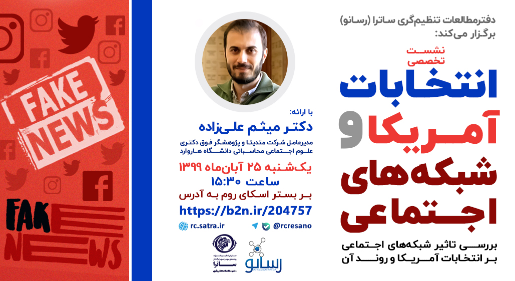 نشست تخصصی » بررسی تأثیر شبکههای اجتماعی بر انتخابات ۲۰۲۰ امریکا و روند آن« با همکاری دفتر مطالعات و تنظیمگری رسانه ساترا و با حضور دکتر میثم علیزاده، پژوهشگر فوق دکتری دانشگاه «هاروارد» امریکا به صورت آنلاین برگزار شد.